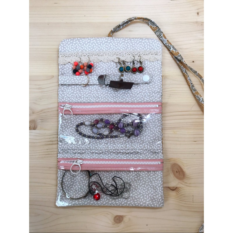 Cette trousse à bijoux est conçue spécialement pour le voyage. La dentelle tout en haut est prévue pour les boucles d’oreilles, la lanière au-dessous pour les bagues, puis deux poches zippées transparentes pour colliers, bracelets ou broches et une dernière poche sans fermeture éclair. Elle se ferme à l’aide d’une lanière en tissu.