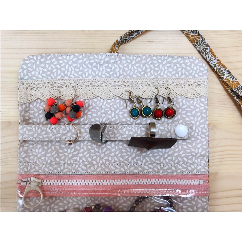 Cette trousse à bijoux est conçue spécialement pour le voyage. La dentelle tout en haut est prévue pour les boucles d’oreilles, la lanière au-dessous pour les bagues, puis deux poches zippées transparentes pour colliers, bracelets ou broches et une dernière poche sans fermeture éclair. Elle se ferme à l’aide d’une lanière en tissu.